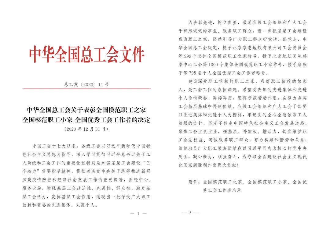 公司工會(huì)榮獲“全國(guó)模范職工之家”榮譽(yù)稱號(hào)